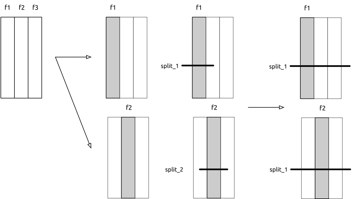 - 每个结点保留全部的数据,但分裂时只使用特定的特征,每个worker使用自己的feature进行分裂,输出候选的分裂集splits
